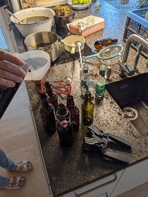 Boil the liquid again for a couple of minutes. Put it into sterilized glass bottles while it's still hot.