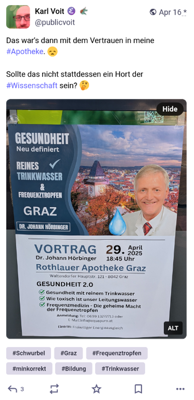 Wie ich auf [1] lese, wird ein "Gesundheitsvortrag mit Dr. Johann Hörbinger" zum Thema Frequenzmedizin beworben, der beim Steirischen Volksbildungswerk (Herdergasse 3) am 11.9.2025 um 18 Uhr abgehalten werden soll.